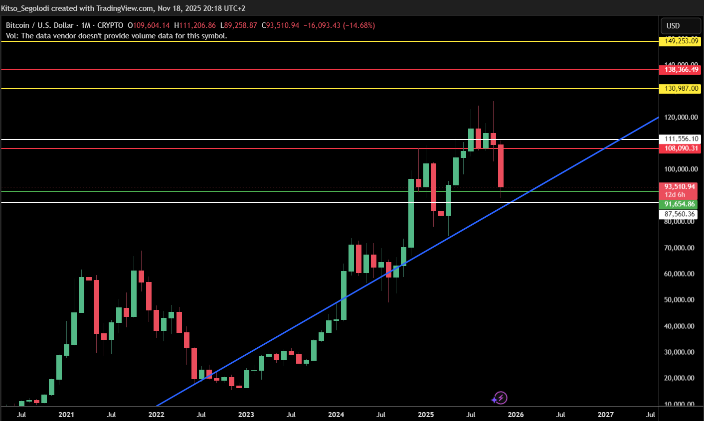 Our analysis of the monthly timeframe points to a clear narrative: Bitcoin is testing a make-or-break accumulation zone between $87,560 and $91,654. This isn't just another level; it's the confluence of a multi-year trendline and a vital support floor. What happens here will likely dictate price action for the remainder of the cycle.