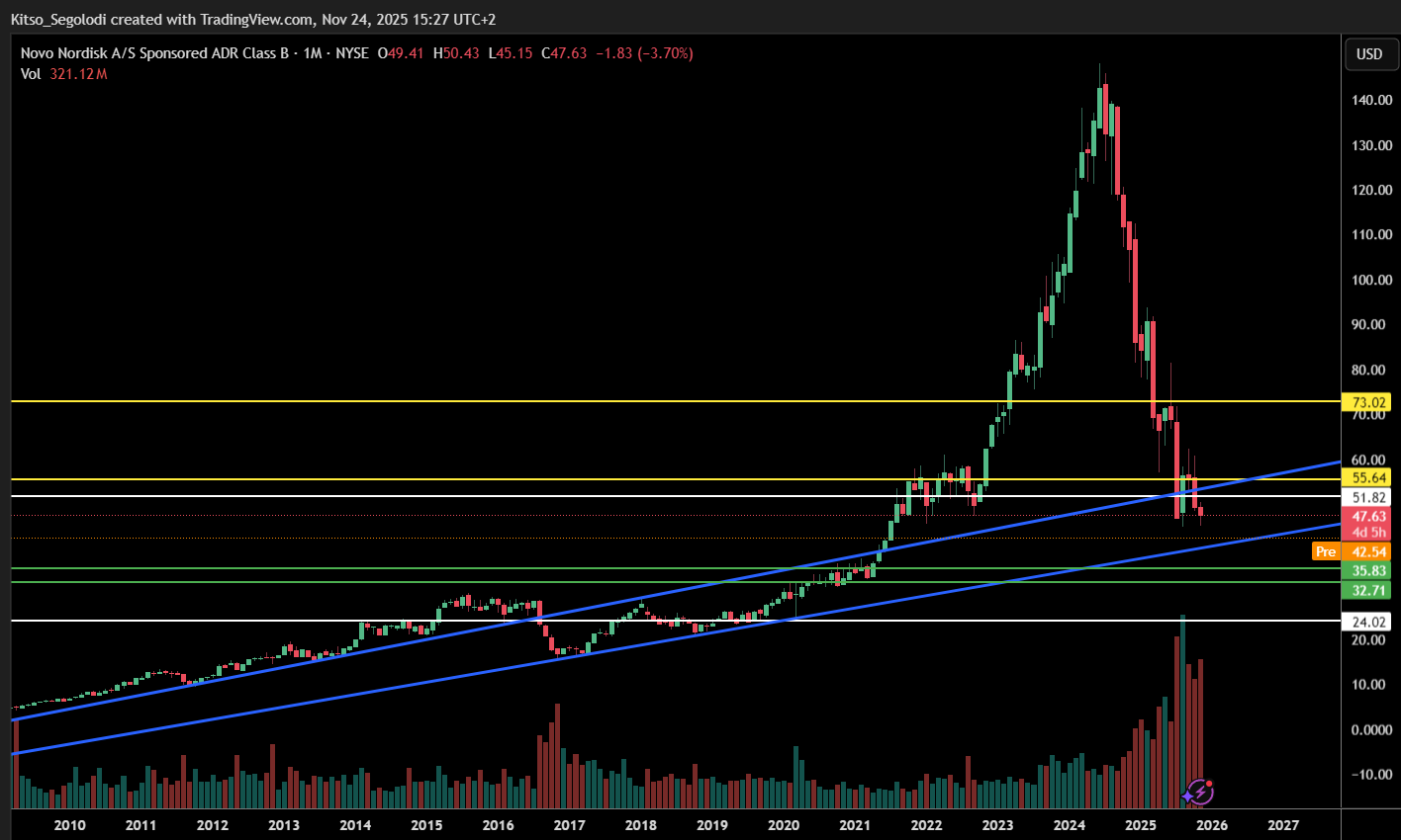 - Major Historical Support: $35.83 - $32.71: This is the high-probability accumulation zone. $35.83 was a formidable resistance level throughout 2020-2021, which should now reverse its role as strong support. A drop into this zone would present a potentially high-conviction buying opportunity for long-term investors, given Novo Nordisk's fundamental strength.