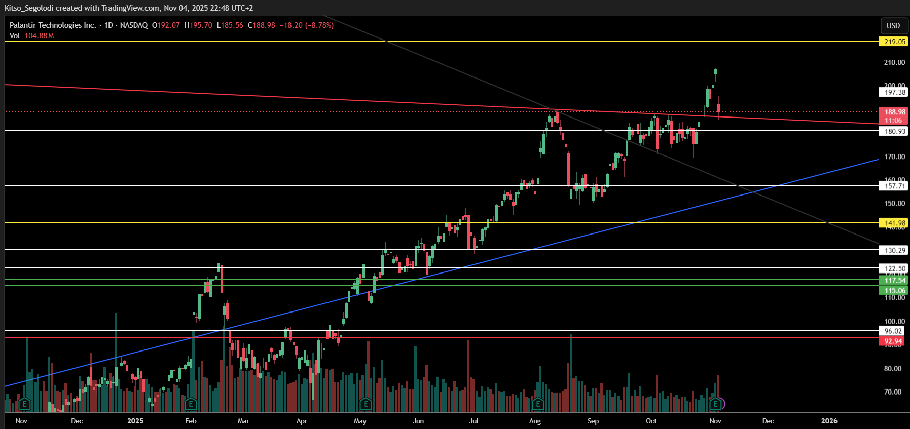 Palantir Technologies Inc. (NASDAQ: PLTR) is trading near a critical support/resistance zone, defined by a long-standing red descending trendline. With price action hovering around $188–$190, the next few candles could determine whether bulls regain control or if valuation concerns trigger deeper consolidation.