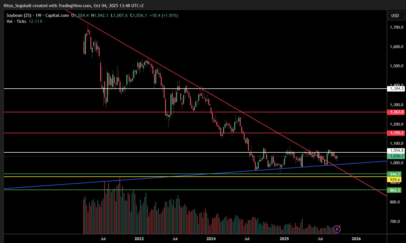 Soybeans have officially broken out of their long-term descending trendline (red), with the breakout candle printed on August 11, 2025. Price is currently trading at $1,036.10, and the structure suggests a potential continuation toward key resistance levels — supported by both technical momentum and evolving global fundamentals.