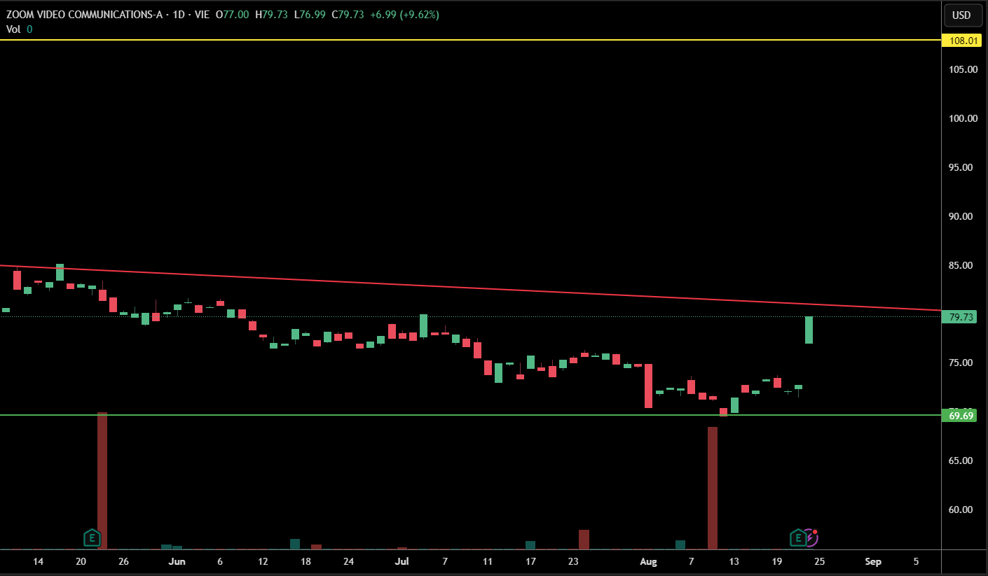 Zoom just posted a powerful +9.62% daily gain, closing at $79.73 — decisively breaking above the descending trendline.